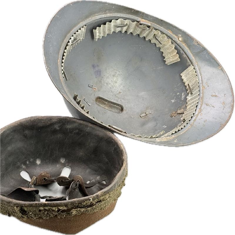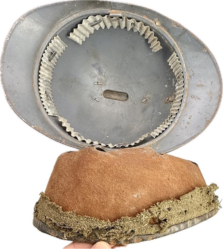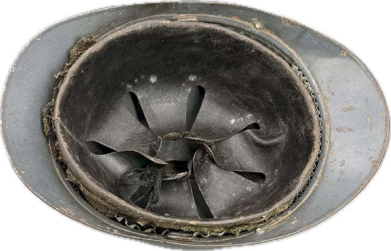 Coiffe en cuir du premier type avec bandeau de laine mité fortement, celle-ci ne tient plus dans le casque (à restaurer). Jugulaire absente.