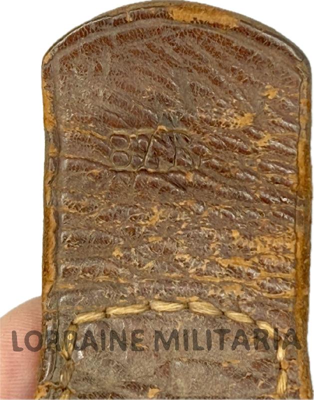 Celle-ci est en bon état, avec une belle patine. Elle est bien marquée du fabricant à Mainz, et datée 1915. De l'autre coté de la patte en cuir, il y a le marquage du 87ème régiment d'infanterie (87 R). Ce régiment fait parti du XVIII ème corps d'armée hessois et était stationné à Mainz.