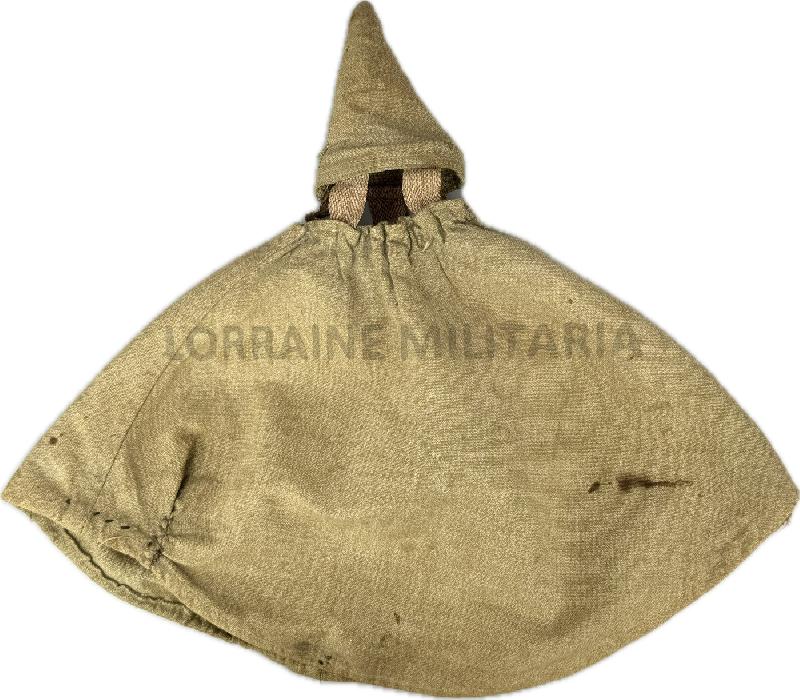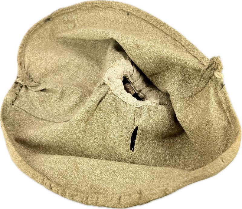 Il s'agit d'un modèle sans crochets de fixation mais avec ficelle sur le pourtour (variante que l'on rencontre moins souvent). Il est en bon état général, quelques taches anciennes, légèrement rétréci sur les deux cotés par pincement de la toile et cousue (pour le mettre à la taille d'un casque).