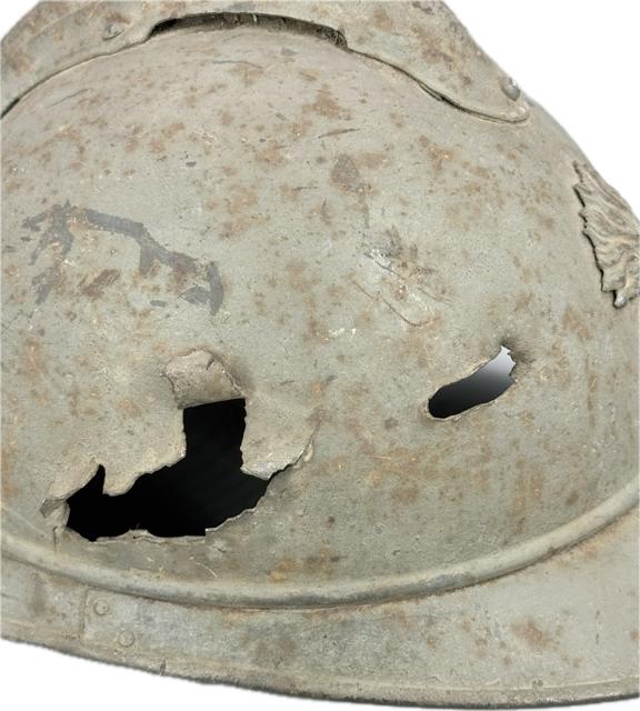 CASQUE ADRIAN INFANTERIE BLEU HORIZON IMPACTS ECLATS D'OBUS Casque Adrian avec insigne à la grenade de l'infanterie ayant subi des dégâts par éclats d'obus.
