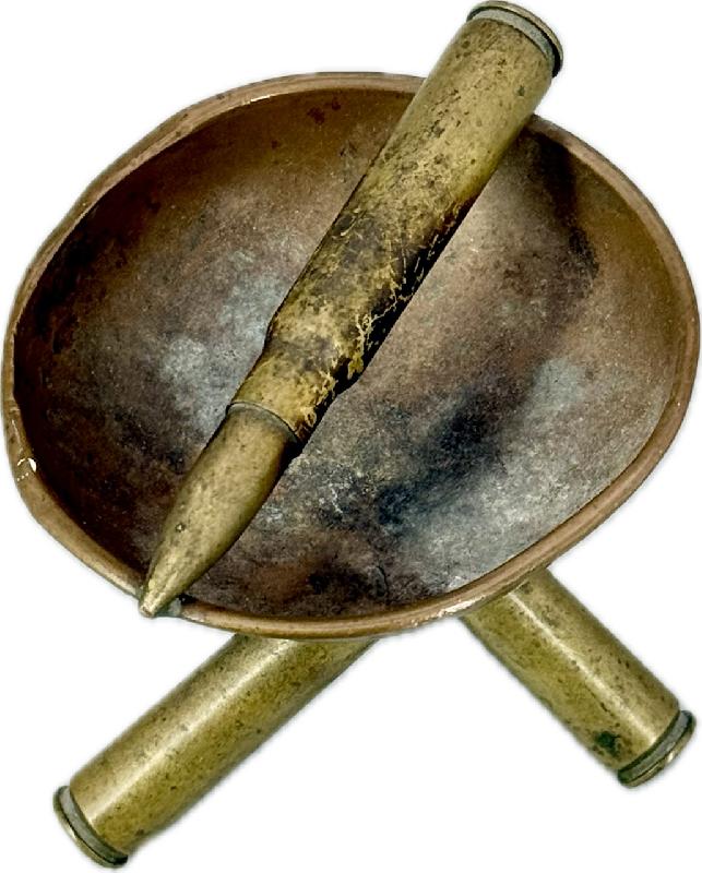 ARTISANAT DE TRANCHEE ALLEMAND CENDRIER EN LAITON Cendrier artisanal en laiton avec cartouches (inertes) de 7,92, il y a également une patte d'épaule en tôle qui malheureusement a perdu sa peinture.