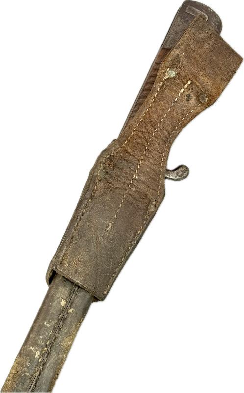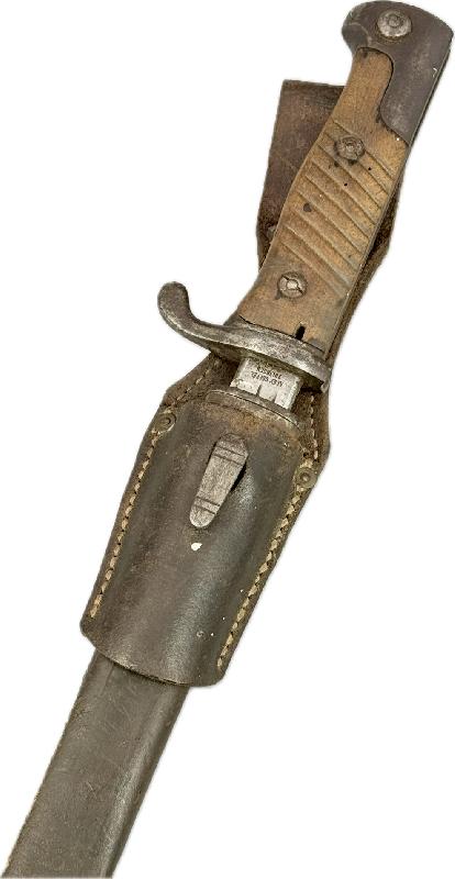 Celle-ci est en bon état général, belle lame (quelques taches d'oxydation), bien marquée du fabricant et datée 1908. Fourreau cuir également en bon état ainsi que le gousset porte-baïonnette.
