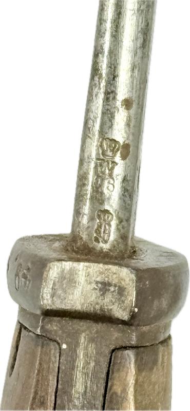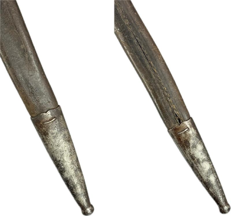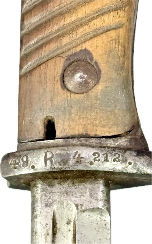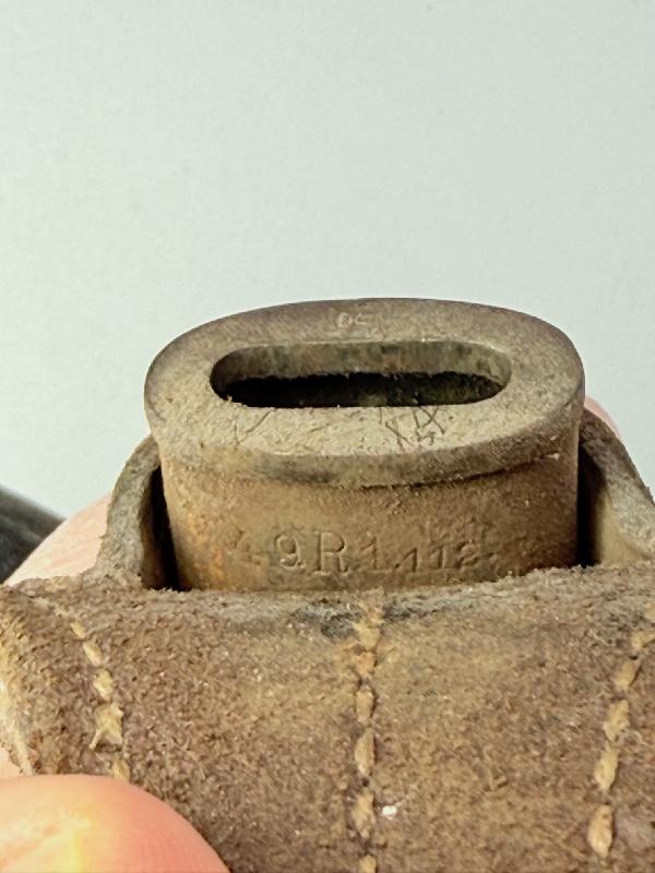 Bien marquée sur la garde du 49ème régiment d'infanterie ainsi que sur le fourreau ( la compagnie n'est pas la même mais cela se rencontre fréquemment). La baïonnette ne rentre pas complètement dans son fourreau, il manque environ 1 cm.