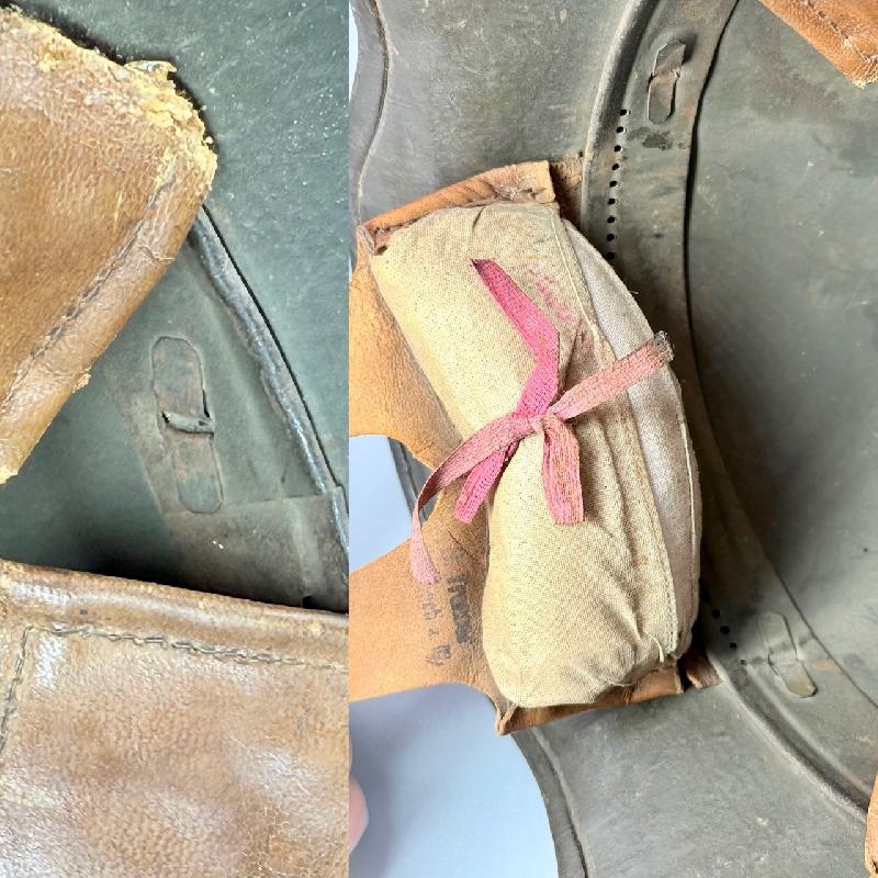 Belle coiffe complète avec ses coussinets en cuir brun qui sont montés sur bandeau métallique. Il y a des traces de col au bout des dents de loups, là ou il y a le cordon de serrage qui passe; certainement déchirés et réparés par de la colle (voir photos).
