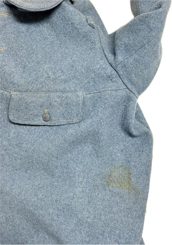 Capote en bon état général, quelques petits trous de mites réparés anciennement, quelques léchures sur le drap mais vraiment infimes. Dans l'ensemble, elle est en bon état. Dans sa longueur d'origine, pas recoupée, présence de la poche à pansement; marquages anciens de costumier, pas de tampon de réception. Le col est un peu décousu à l'intérieur au niveau de la doublure et il manque la patte de support du ceinturon (voir photos).