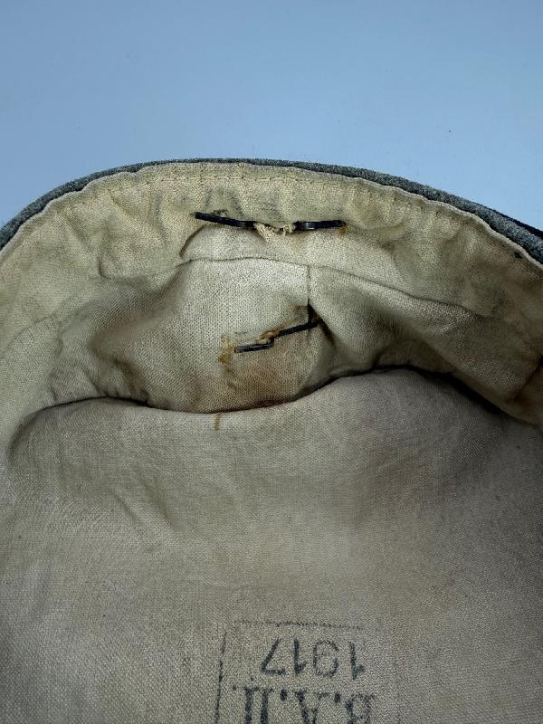 Celle-ci est en relativement bon état, quelques trous de mites sur le pourtour et le bandeau (voir photos). Bien marquée du 2ème corps d'armée prussien et datée 1917. Tampon taille 59.