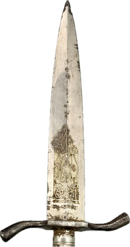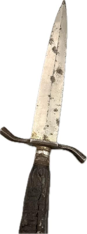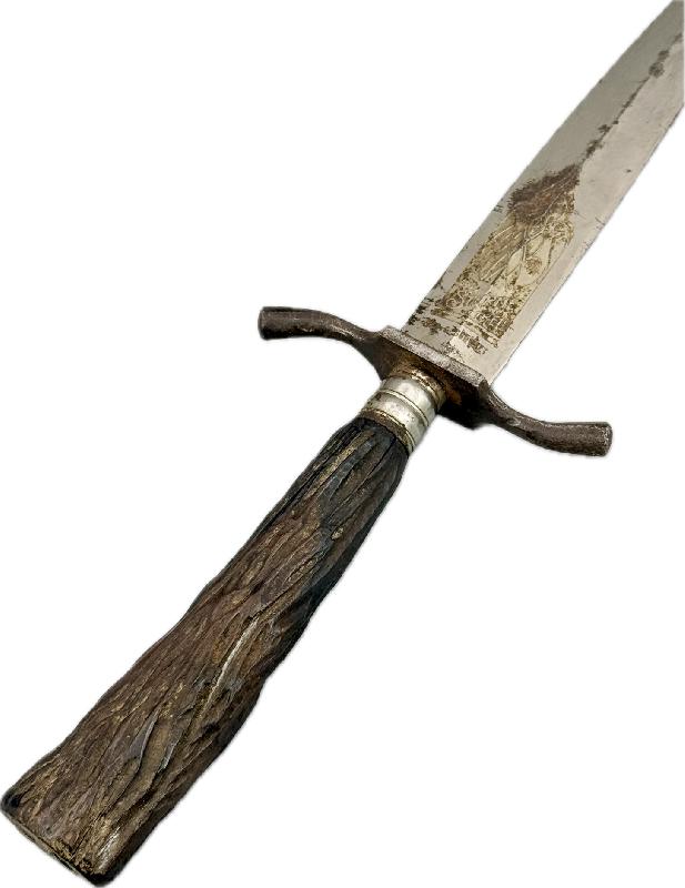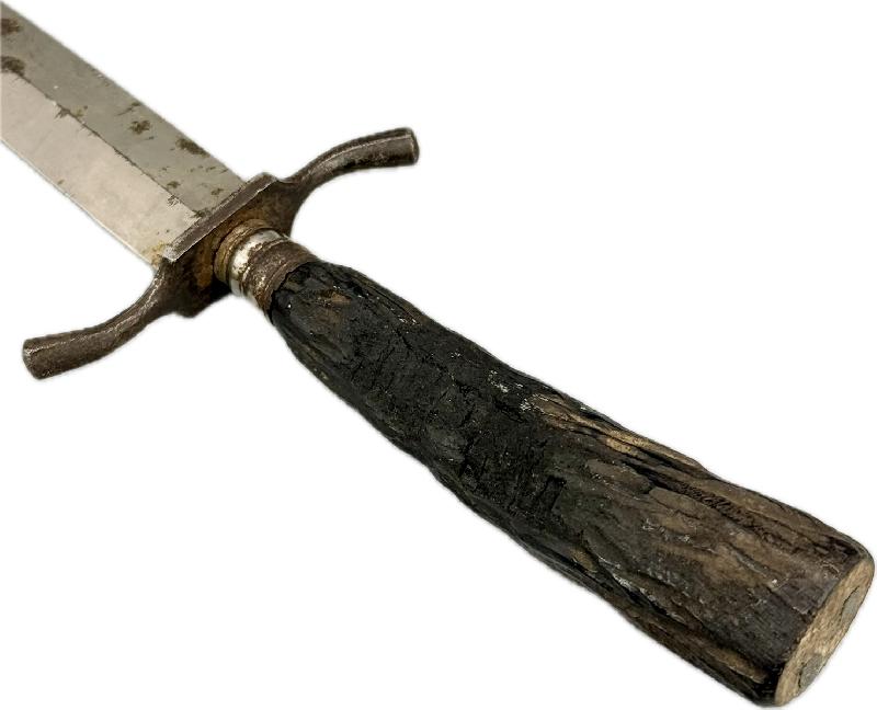 Le manche en bois est brulé sur l'arrière du couteau (voir photos), belle lame avec gravure dans sa longueur d'origine, traces de rouille par endroits sur celle-ci et près de la pointe (voir photos).
