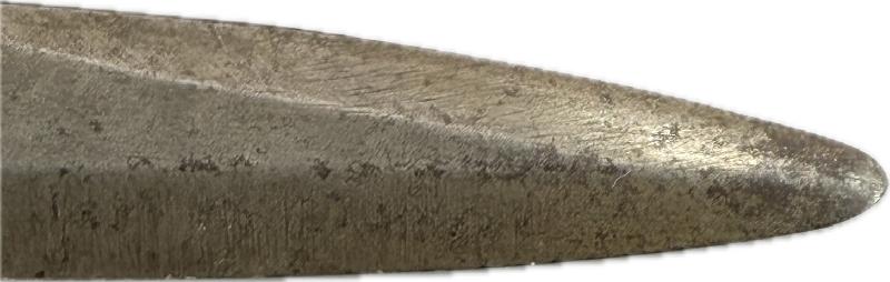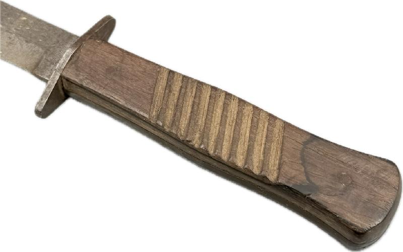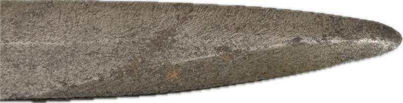 Le manche en bois est en bon état, la lame a été aiguisée à une époque, et a perdu son pointu sur le bout de la lame (voir photos).