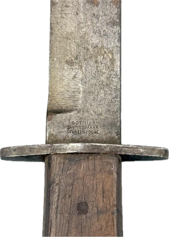 COUTEAU COMBAT ALLEMAND GOTTLIEB SANS FOURREAU Couteau de combat avec manche en bois, lame bien marquée du fabricant "GOTTLIEB" à Solingen, et poinçon de réception impérial.