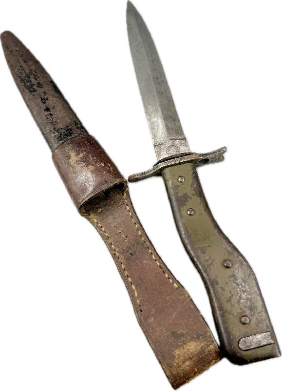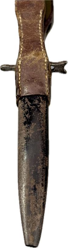 COUTEAU COMBAT ALLEMAND DEMAG COMPLET Couteau de combat du modèle Demag, il est complet avec son fourreau qui a subi une modification avec ajout d'un porte fourreau cuir sur mesure. Modification pour un sous-officier ou officier?