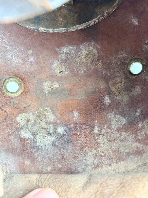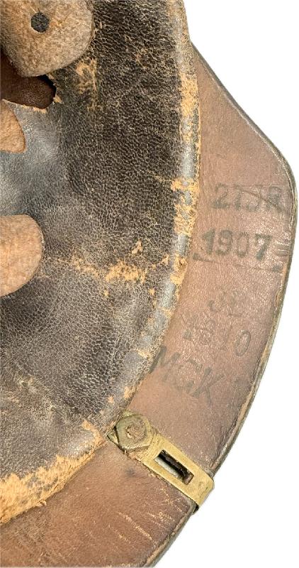 Celle-ci est en bon état général, des coups dans le vernis du casque sur l'arrière, coiffe présente avec des accidents sur les dents de loup (voir photos). Tampon du fabricant à l'intérieur et bien marqué du 27ème régiment d'infanterie, de la compagnie des mitrailleurs (MGK) et daté 1907 / 1910.