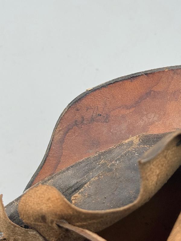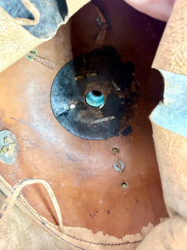 Celui-ci est en bon état général, belle bombe en cuir verni, jugulaires à écailles plates des troupes à pied, cocarde badoise (manque la reich cocarde), il manque un rivet sur l'embase de la boule (voir photos) et sur un des rivets, il y a une patte de cassée mais rien ne bouge.