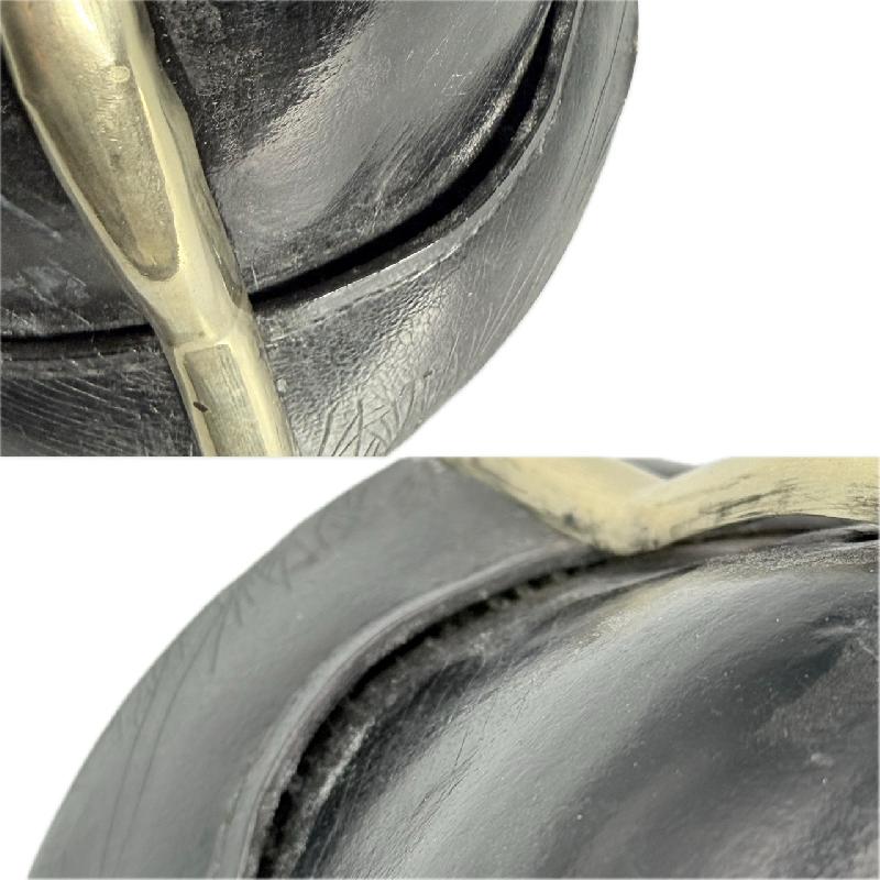 A noter que la jugulaire est abimée (accrocs, déchirures) à 2 endroits (voir photos) et que la nuquière est un peu décousue sur l'arrière droit (voir photos).