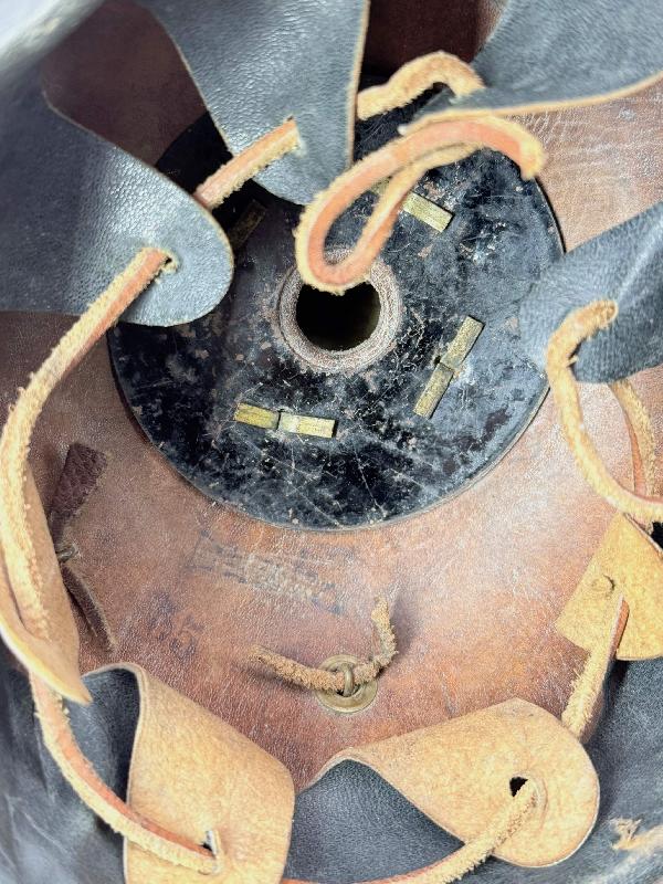 Coiffe complète en bon état, pas de marquages apparents mis à part la taille (55) et présence de nom d'un soldat.