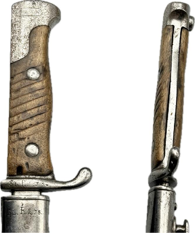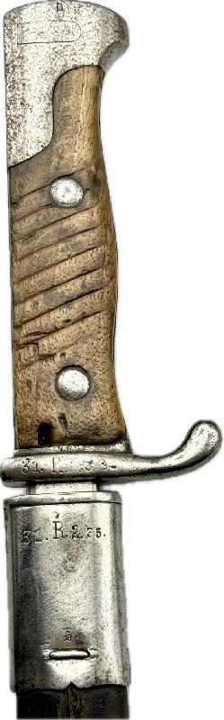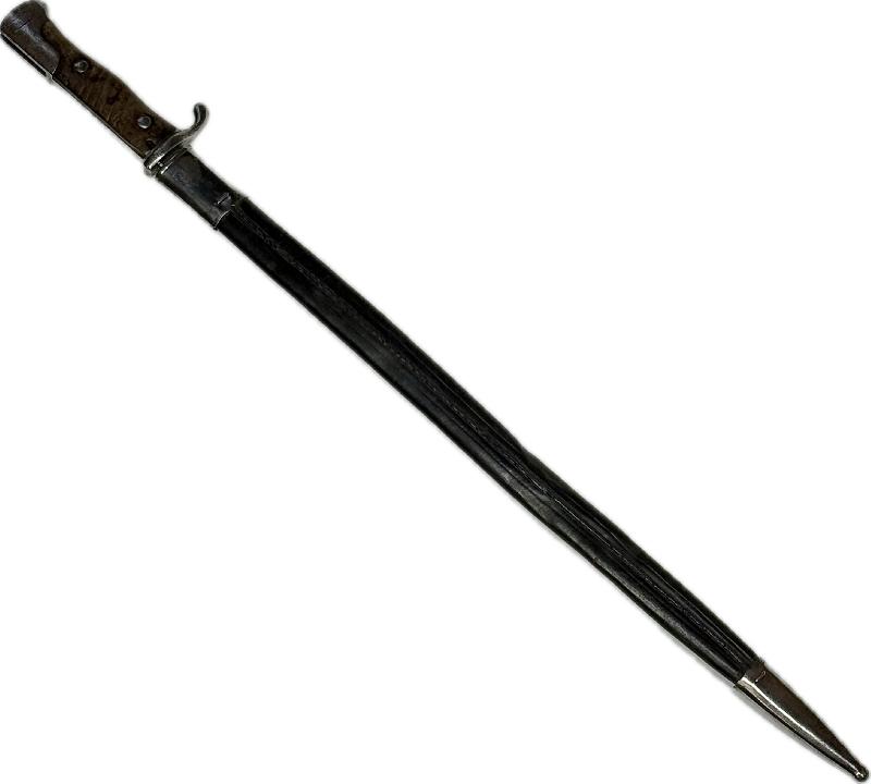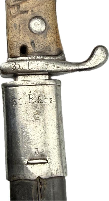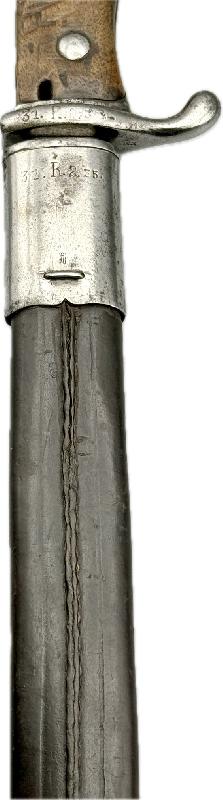 BAIONNETTE MLE 1898 2ème TYPE DU 31 ÈME REGIMENT D'INFANTERIE AVEC FOURREAU Baïonnette Mle 1898 du second type, dite langue de carpe, régimentée au 31ème régiment d'infanterie.