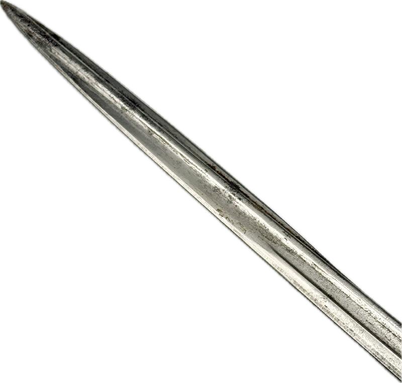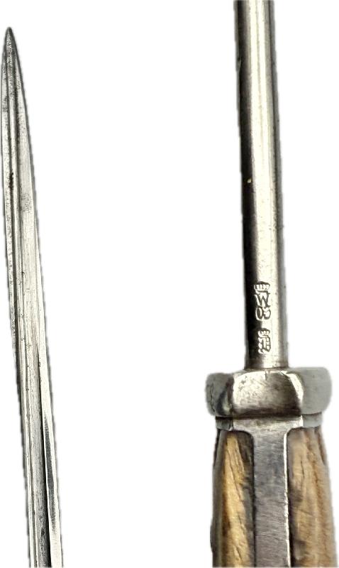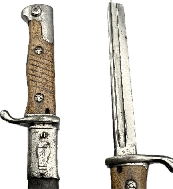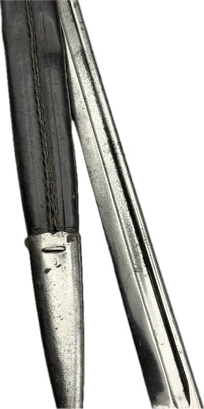 Celle-ci est complète avec son bon fourreau régimenté comme la baïonnette. Elle est en bon état général, légèrement frottée à une époque, fourreau avec coutures solides. Il manque quelques millimètres pour que la baïonnette rentre complètement dans le fourreau. Lame en bon état, quelques piqures sur le bout, bien marquée du fabricant à Erfurt, et poinçons de réception.
