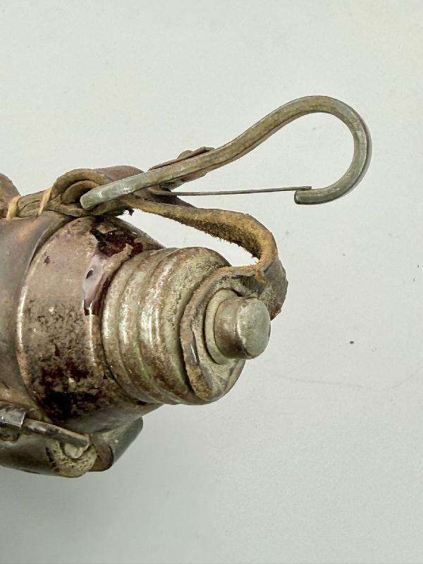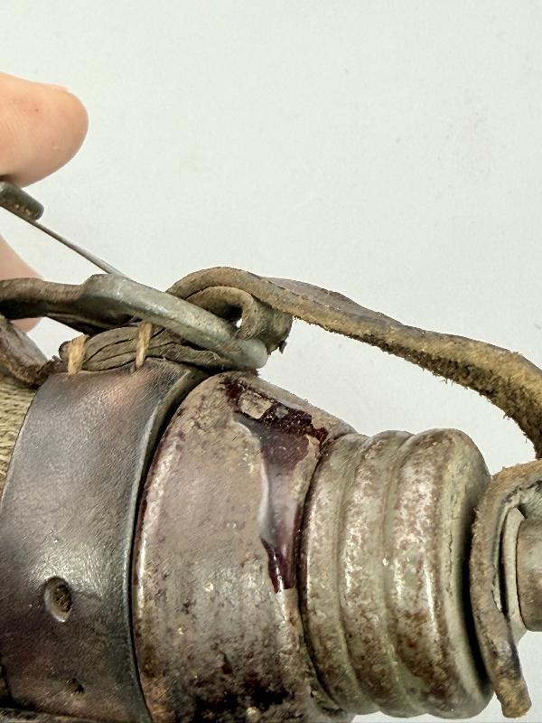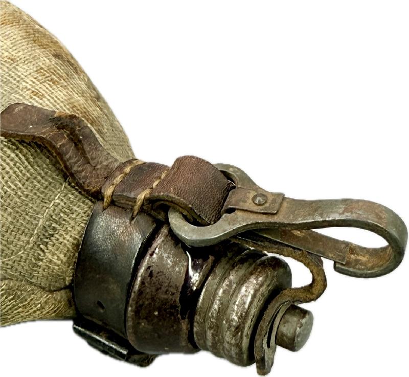 Celle-ci est dans son jus, avec une housse en fibre d'orties feldgrau. Elle est complète avec son bouchon et crochet de fixation. Il y a des traces d'usures, de rouille par endroits. A noter qu'il manque un petit bouton sur l'arrière et que la petite boucle en cuir retenant le mousqueton est cassée (voir photos). .