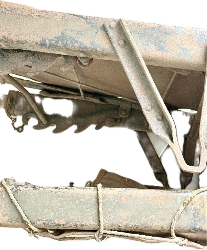 Sur le cadre métallique peinture de fond noire recouverte de peinture feldgrau. Traces d'usages, fleur de rouille, à nettoyer.