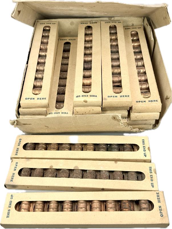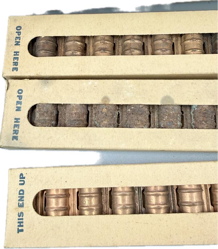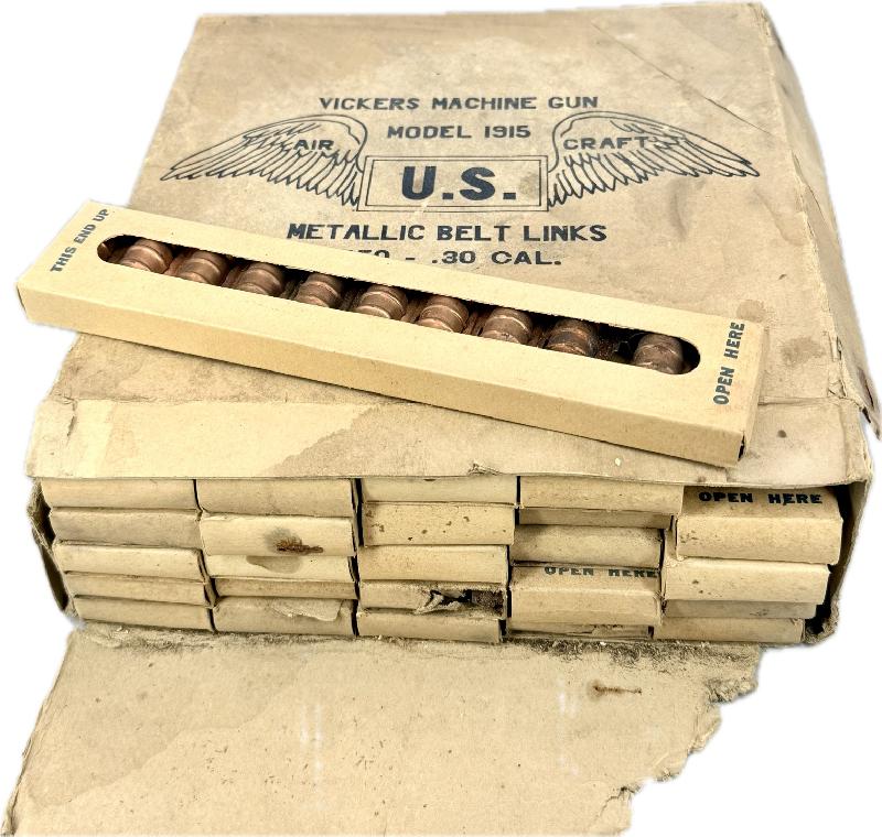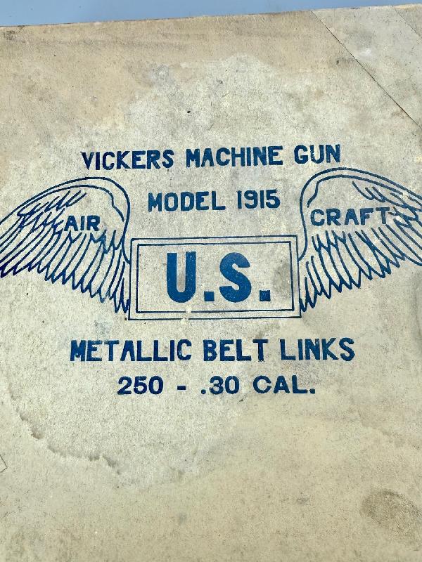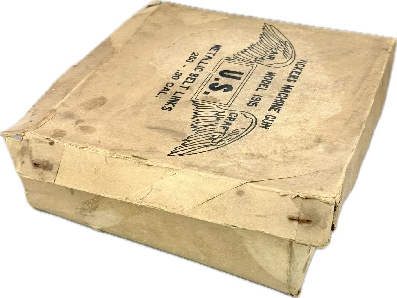 SUPERBE BOITE D'ORIGINE USA AVEC 250 MAILLONS BANDE MITRAILLEUSE AVIATION Superbe boite d'origine contenant 25 boites de 10 maillons pour bande de mitrailleuse aviation de la première guerre mondiale, ce qui fait un total de 250 coups.