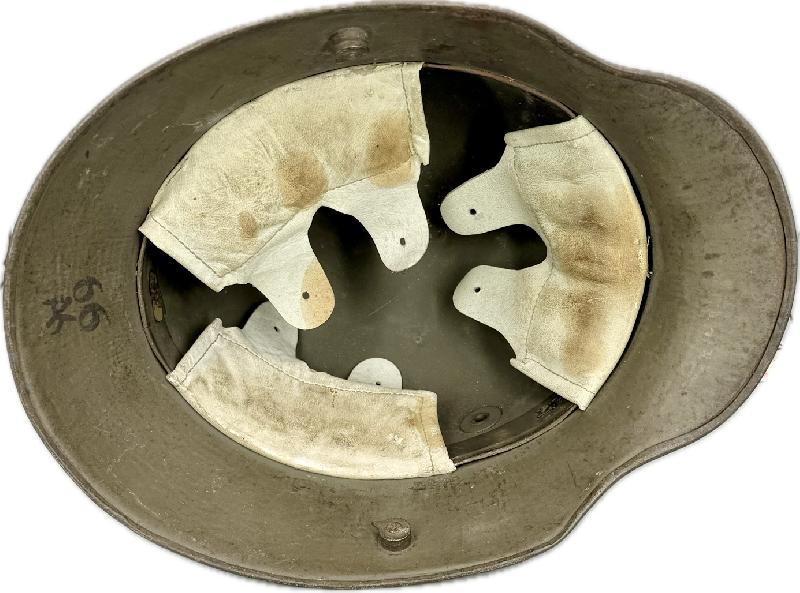 Casque complet avec sa coiffe en cuir blanc montée sur cerclage métallique typique des fabrication fin de guerre. Il est en très bel état, avec une belle peinture feldgrau, la coiffe est en excellent état; celle-ci possède 2 coussins de crin (il en manque un, voir photos). Bien marqué AK et taille 66.