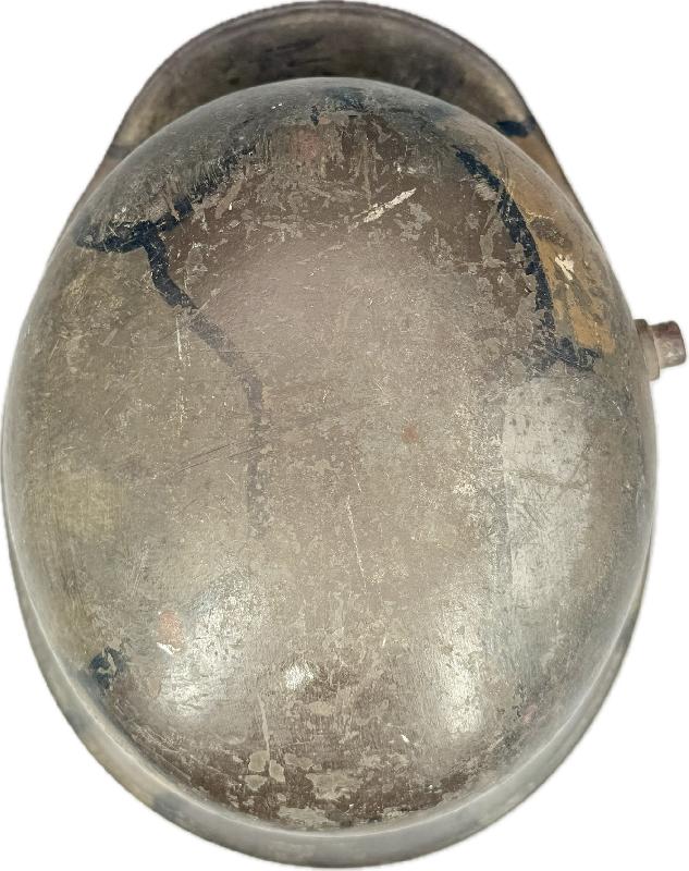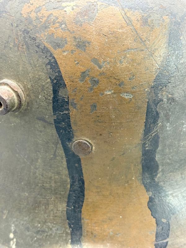 Casque nature mais qui a subi les affres de la guerre puisqu'un tourillon extérieur a été arraché sur le coté gauche.