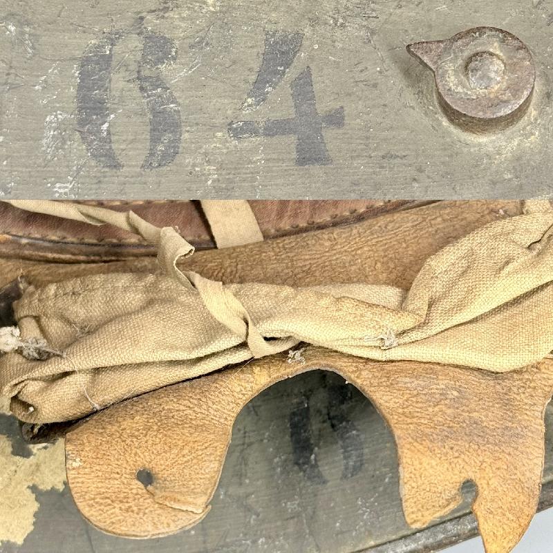 La coiffe est présente, n'a jamais été touchée, démontée mais elle est en état moyen et est fragile. Un des 3 coussins de cuir est arraché du bandeau mais il est encore là. Ceux-ci sont vides de leur coussin de crin.