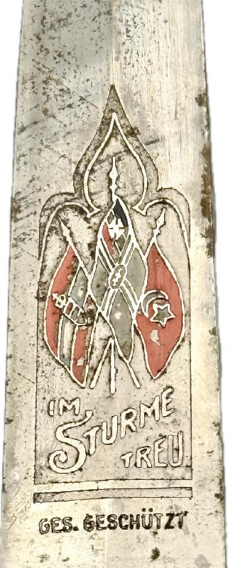 Couteau de combat troupe, modèle avec fourreau cuir et lame gravée avec devise "Fidèle dans la tempête" et drapeaux de l'alliance germano- ottomane.