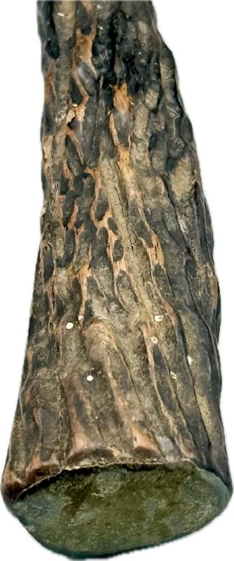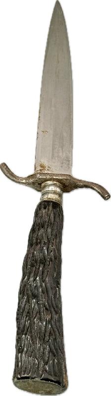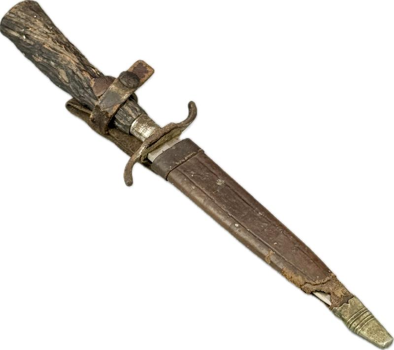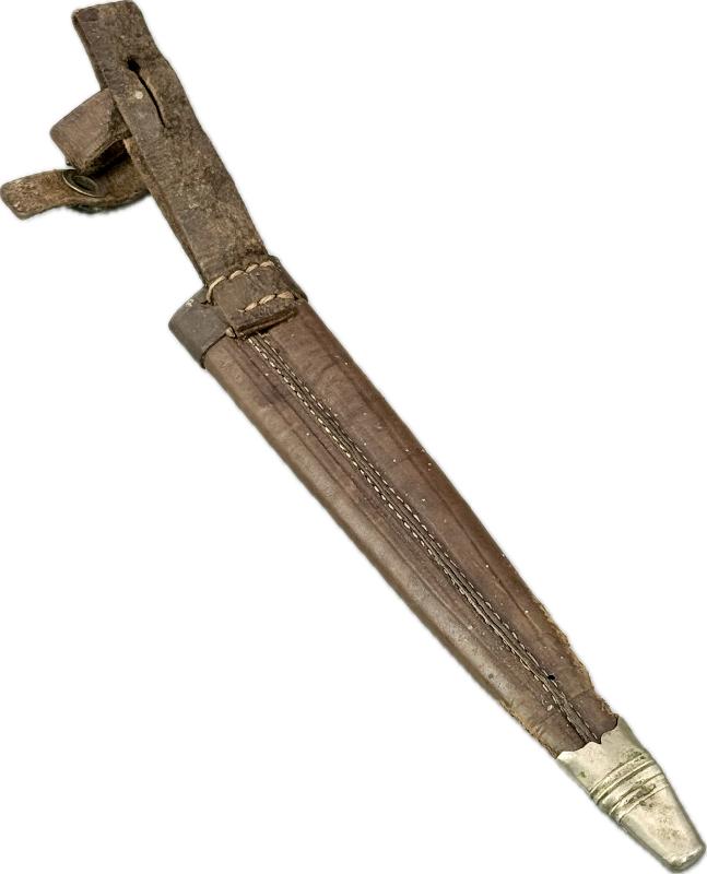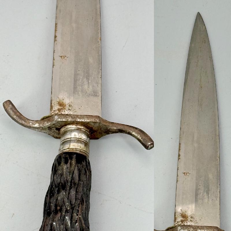 Il est dans son jus, pas nettoyé, très belle lame non touchée dans sa finition d'origine, manche en bois imitant la corne de cervidé, garde en S avec une légère oxydation du coté de la gravure (voir photos). Fourreau en cuir au modèle qui a malheureusement été grignoté sur le bas par un rongeur; mais rien n'est cassé ou manquant.