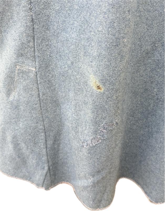 Elle est en bon état général, des traces d'usures, quelques légers trous de mites (voir photos), anciennes réparations sur des accrocs (les coudes et l'arrière du manteau). Une des manches est usée sur le bas, avec la laine qui s'est découpées sur quelques centimètres. Les deux manches sont un peu décousues sur l'arrière (voir photos).