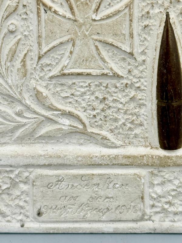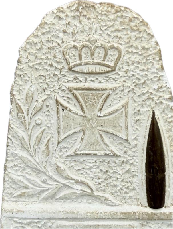 ARTISANAT TRANCHEE ALLEMAND CRAIE SCULPTEE SOUVENIR COMBAT 1914/1916 Travail artisanal de tranché typique allemand, borne en craie sculptée représentant un monument avec croix de fer, couronne impériale et feuilles de laurier. Dans la craie est insérée une ogive de 8mm française tirée. Sur le bas, un cartouche avec l'inscription "Souvenir de la campagne 1914/1916".