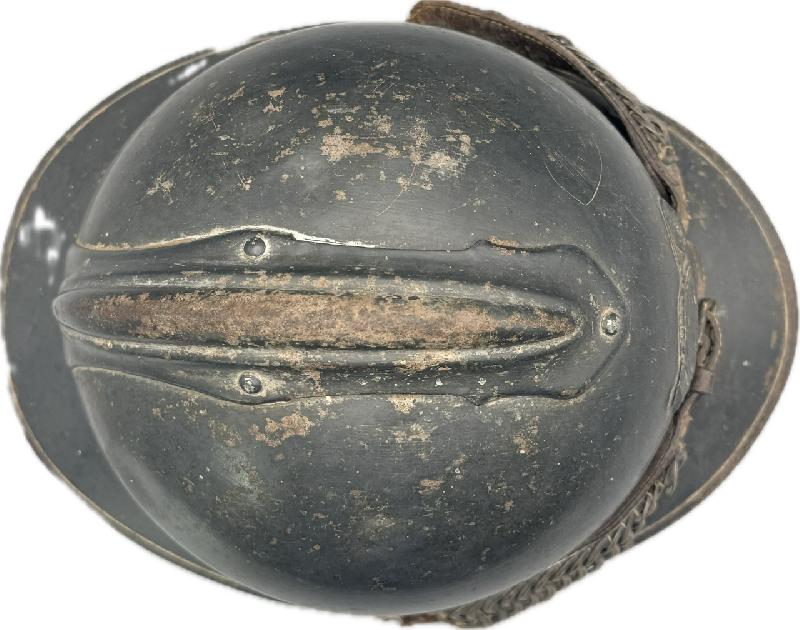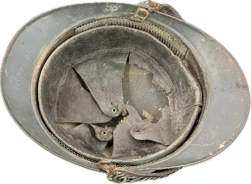Casque dans son jus, monté avec une jugulaire d'officier en cuir avec chaînette de cavalerie.