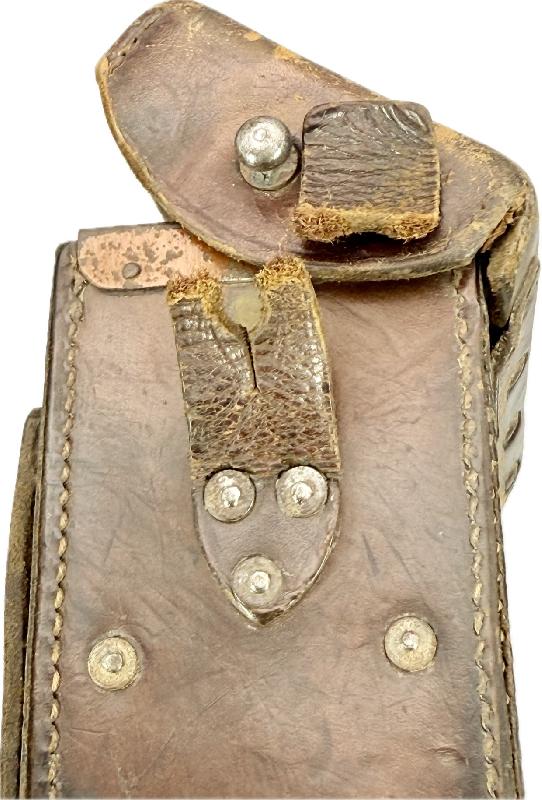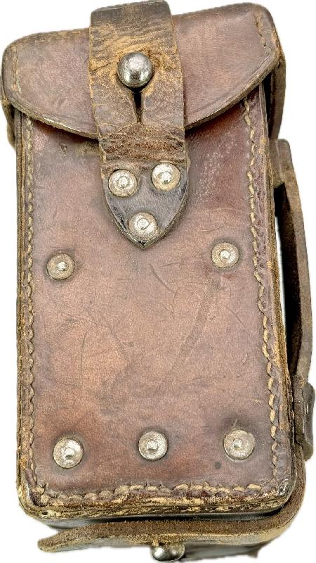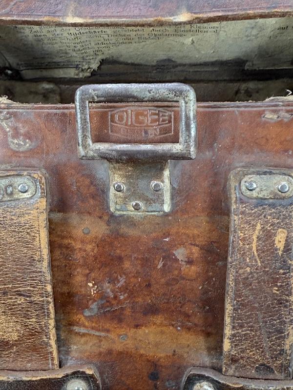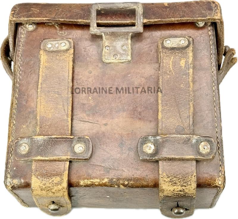 Etui cuir de transport complet, à noter une des deux sangles de fermeture est cassée mais le morceau de cuir est présent, étiquette présente dans le rabat (légèrement abimée sur un coté (voir photos).