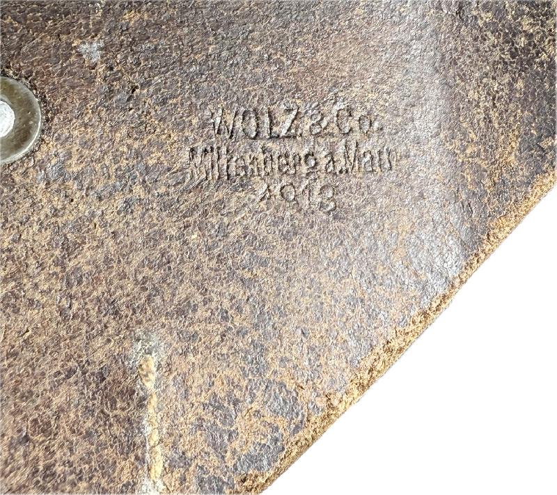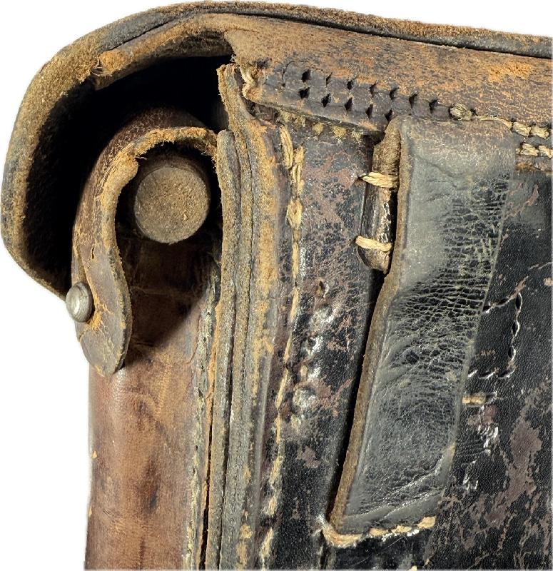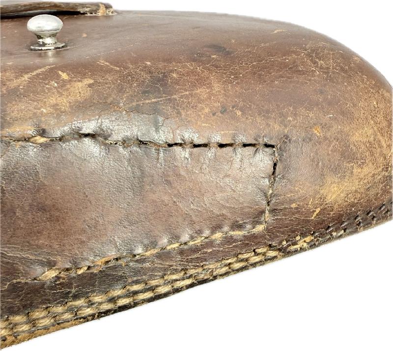Celui-ci est en cuir marron sur la face avant et noir sur l'arrière, il est bien marqué du fabricant et daté 1918, poinçon à la couronne (bavière). Il est en état moyen, sangle de fermeture du rabat cassée, bout manquant; quelques coutures ont lâché, au niveau du rabat, du logement de la clé dans le rabat. Abimé sur un coté du fermoir de baguette. VOIR PHOTOS