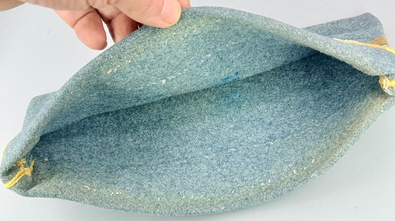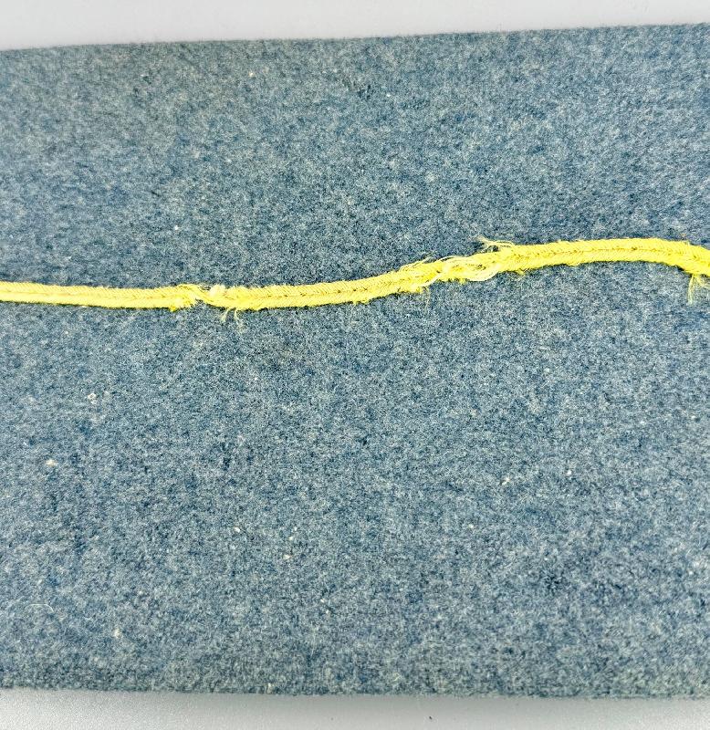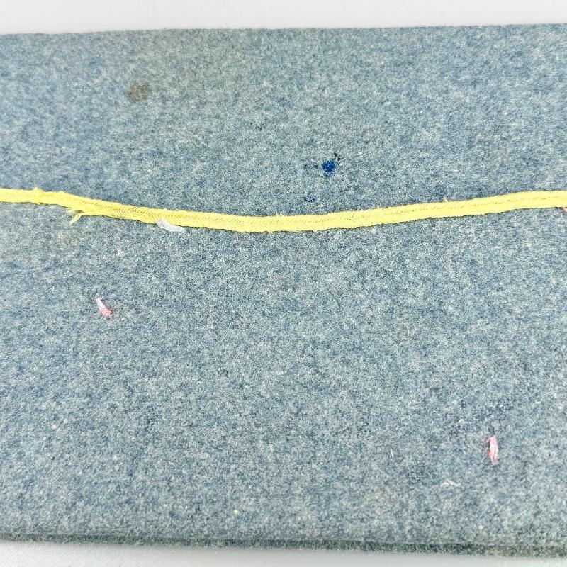 Passepoil, liseré jonquille abimé par endroits , des traces d'usage et usures sur le drap, quelques minuscules trous de mites.