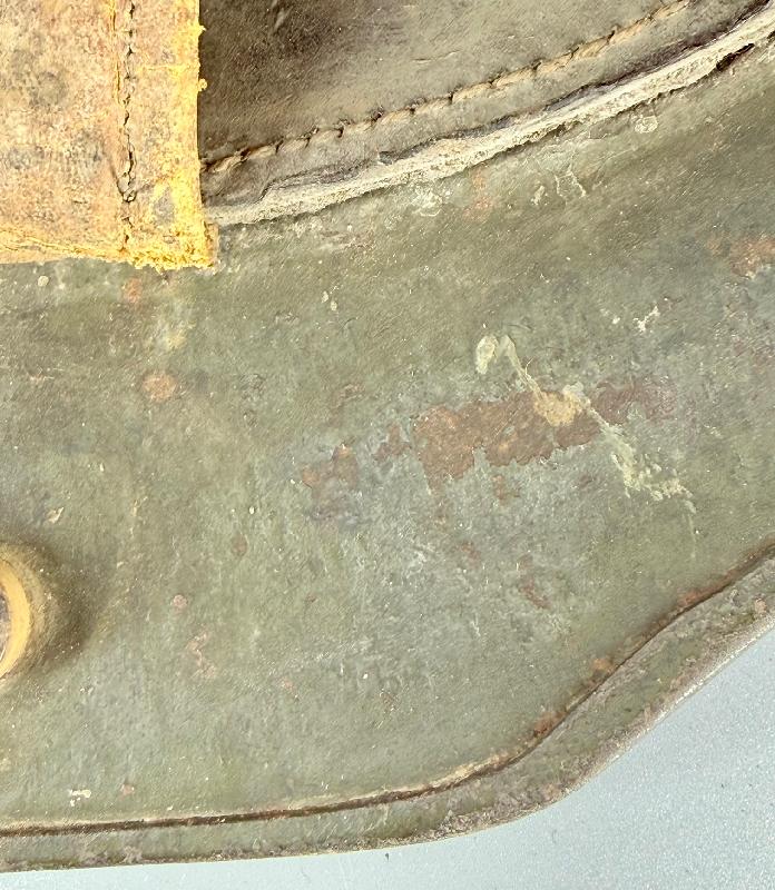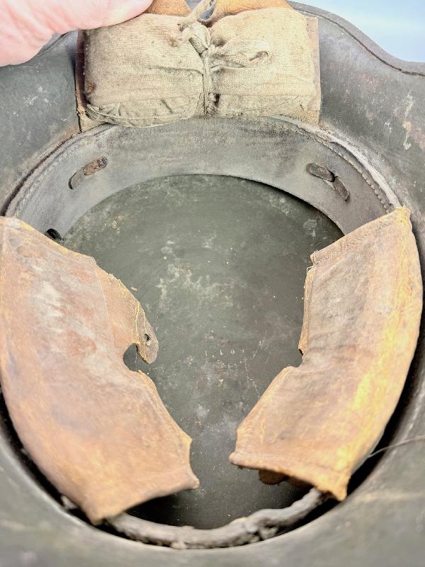 Celui-ci sort de grenier, il est dans son jus, jamais touché, même pas un coup d'éponge. Bandeau cuir du premier type, avec ses 3 coussinets; un des trois coussinets a 2 dents de loups déchirées au niveau des trous du lacet de serrage mais les 2 trous ont été refait un peu au dessus (certainement fait en période de guerre). Sur un des coussinets, il y a un nom de marqué mais illisible.