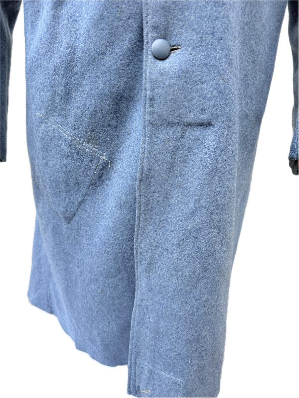 Capote en bon état général, quelques petits trous de mites réparés anciennement, quelques léchures sur le drap mais vraiment infimes. Dans l'ensemble, elle est en bon état. Dans sa longueur d'origine, pas recoupée, présence de la poche à pansement; marquages anciens de costumier, pas de tampon de réception. Le col est un peu décousu à l'intérieur au niveau de la doublure et il manque la patte de support du ceinturon (voir photos).