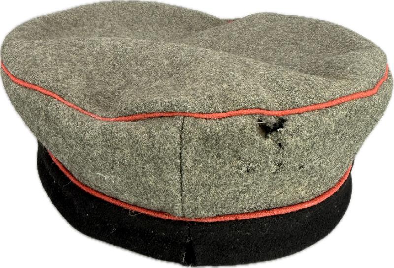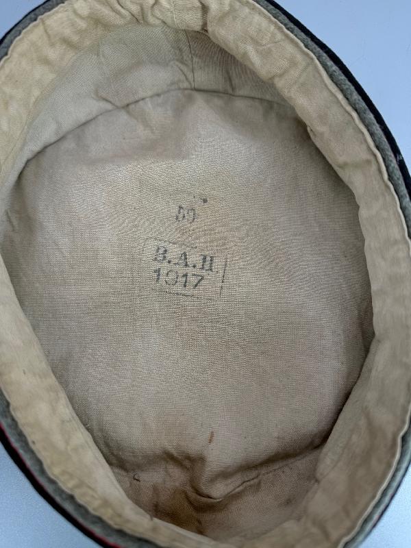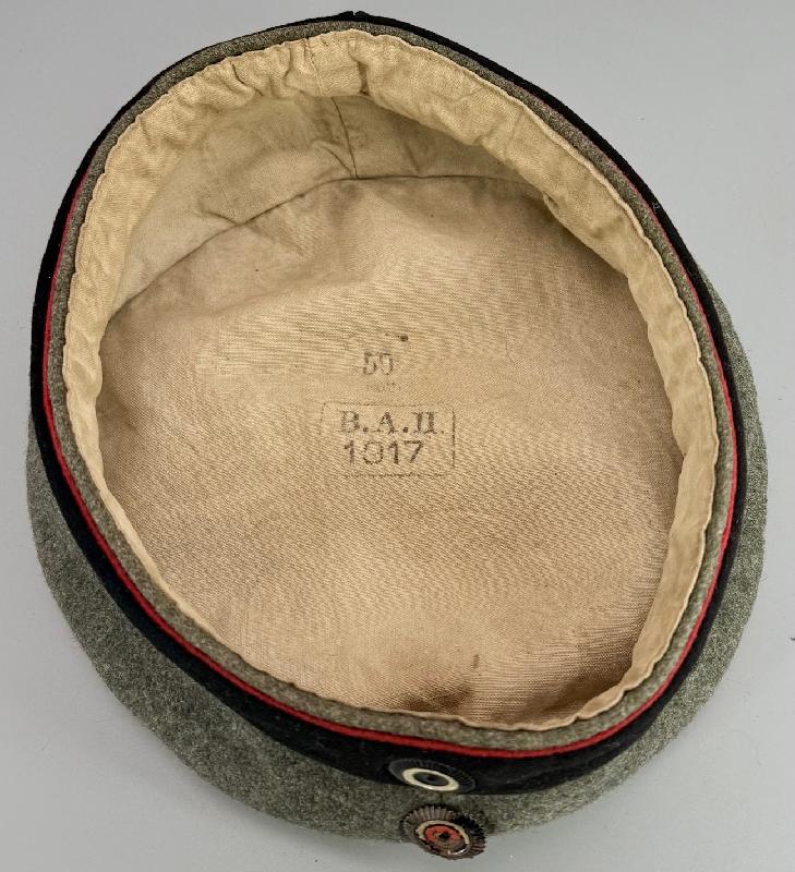 MUTZE TROUPE ALLEMANDE MODELE 1907 ARTILLERIE PIONNIER PRUSSE BAII 1917 Mutze troupe modèle 1907 en drap feldgrau avec bandeau noir des troupes d'artillerie ou des pionniers de la Prusse.