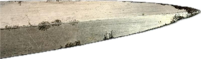 Le manche en bois est brulé sur l'arrière du couteau (voir photos), belle lame avec gravure dans sa longueur d'origine, traces de rouille par endroits sur celle-ci et près de la pointe (voir photos).