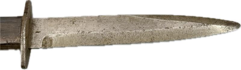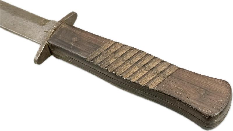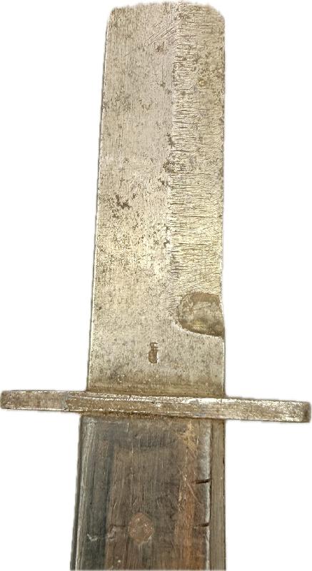 Le manche en bois est en bon état, la lame a été aiguisée à une époque, et a perdu son pointu sur le bout de la lame (voir photos).