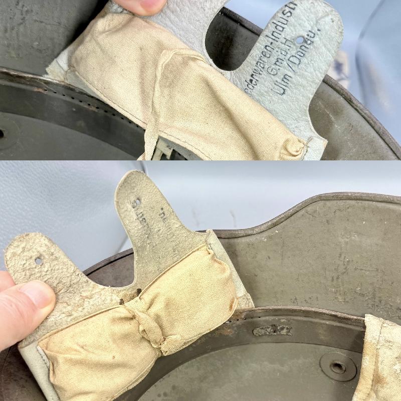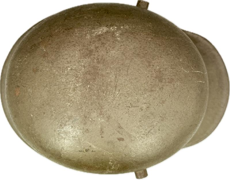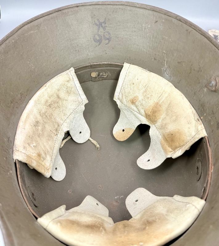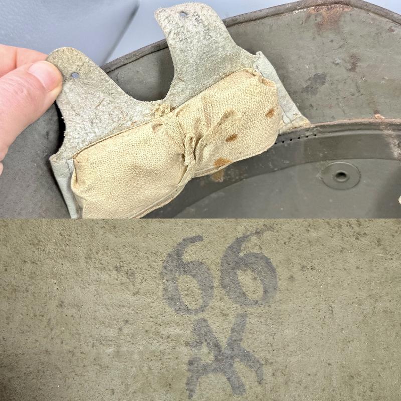 Casque complet avec sa coiffe en cuir blanc montée sur cerclage métallique typique des fabrication fin de guerre. Il est en très bel état, avec une belle peinture feldgrau, la coiffe est en excellent état; celle-ci possède 2 coussins de crin (il en manque un, voir photos). Bien marqué AK et taille 66.