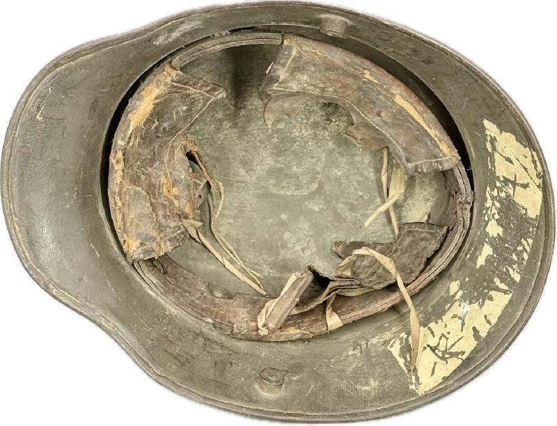 Casque nature mais qui a subi les affres de la guerre puisqu'un tourillon extérieur a été arraché sur le coté gauche.