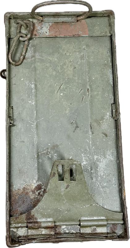 Celle-ci est en bon état général, belle peinture kaki encore présente (un coté un peu rouillé, voir photo), bande rouge sur le pourtour de la caisse.