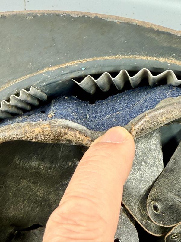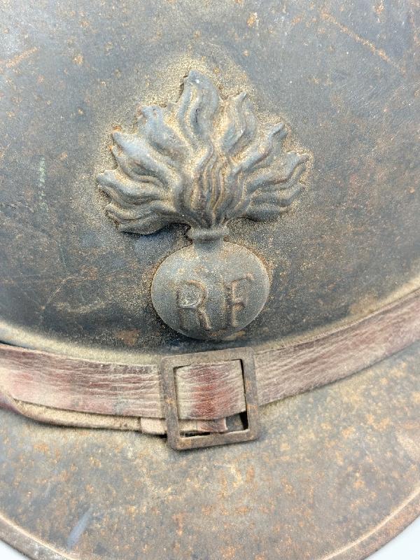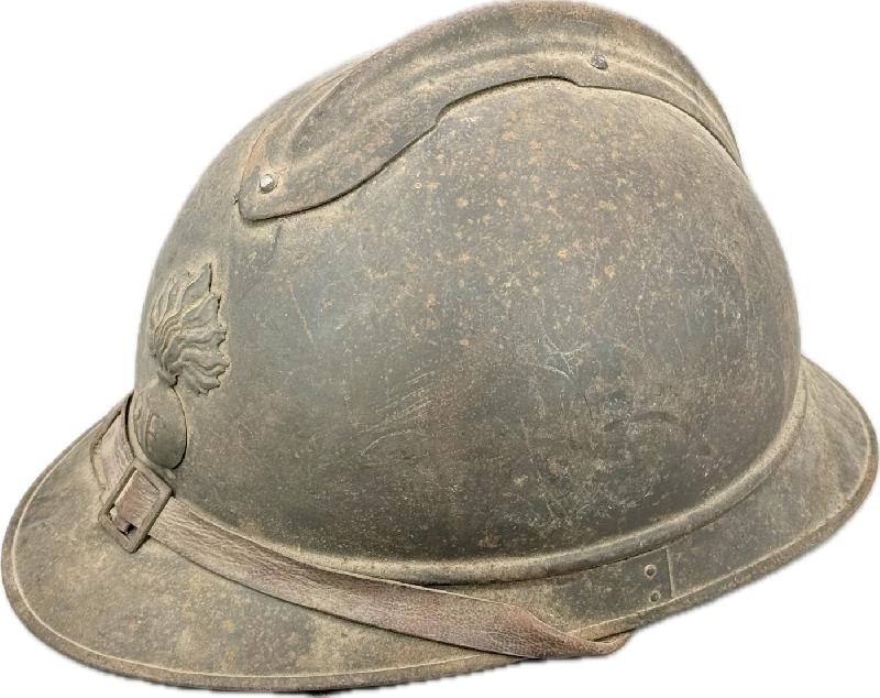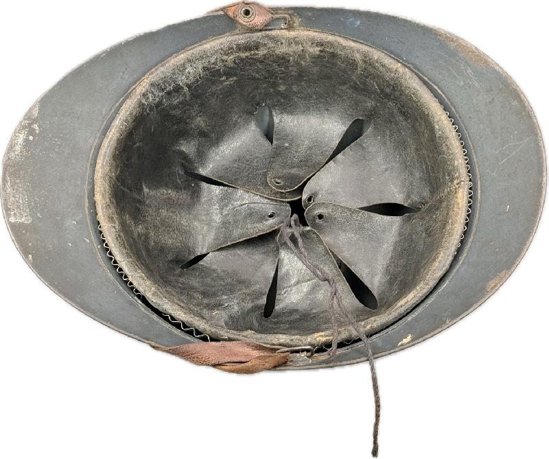 Casque en bon état général, complet avec sa coiffe et sa jugulaire. La coiffe est du premier type avec bandeau en laine gris-de-fer-bleuté.