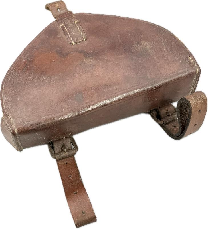 Bel étui cuir, complet, aucun manque ou casse. Celui-ci n'est pas marqué d'un fabricant. A noter un petit trou sur une des languettes de fermetures des outils d'entretien (voir photos). Scie articulée en tôle complète, il manque les manches en bois dans l'étui.